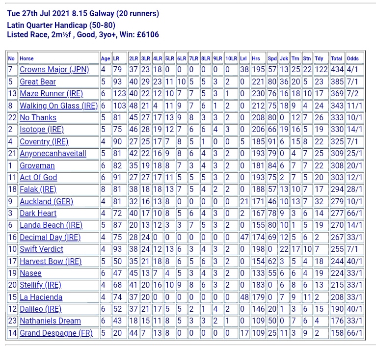 The 5:10 at Galway on Tuesday (historically a decent maiden, average winning RPR of 89) see's TWINKLE making her 2nd appearance after showing some promise on debut (RPR 76). She's a full sister to Anthony Van Dyke who came on 25lb for his first run.🏇