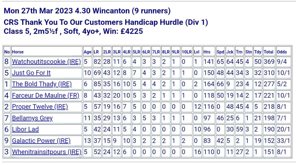 - Just Go For It (6/1): Won her first race in 2 years due to steward’s decision over C&D and performed well at Taunton. Can’t be ruled out.