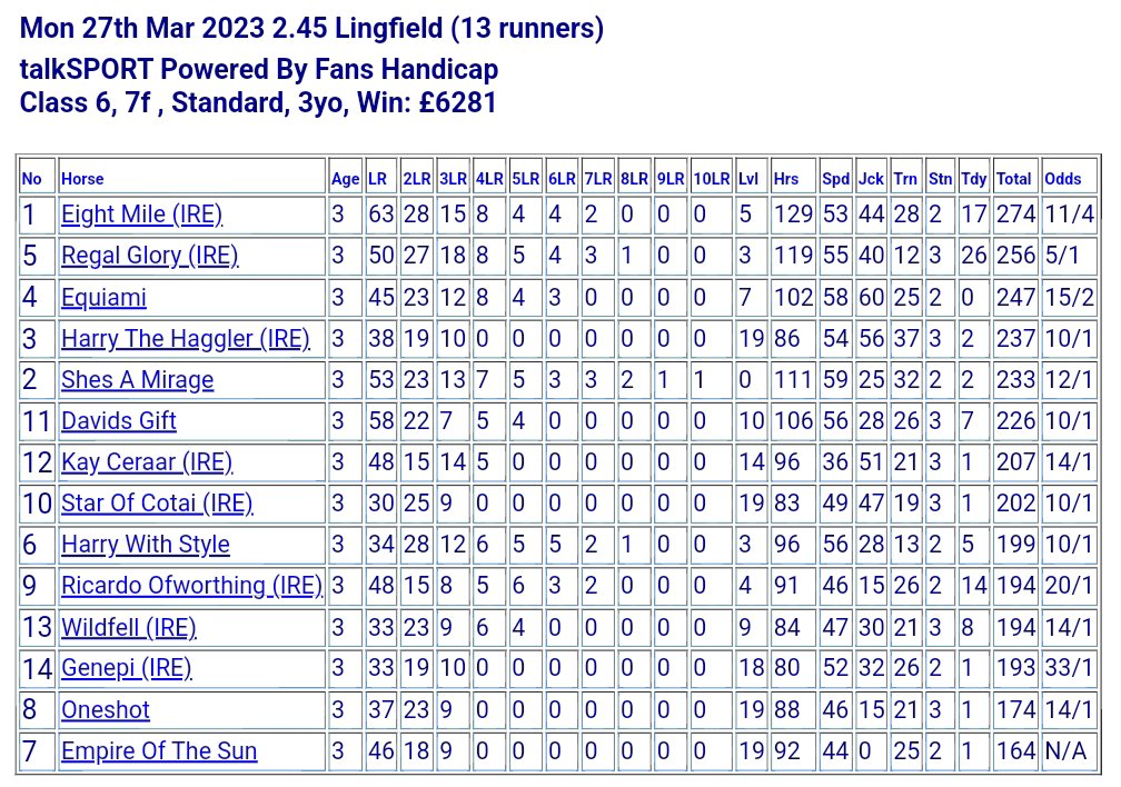 - Equiami (14/1) Not without hope on handicap form last backend. Needs to show support from stall 13 before considering.