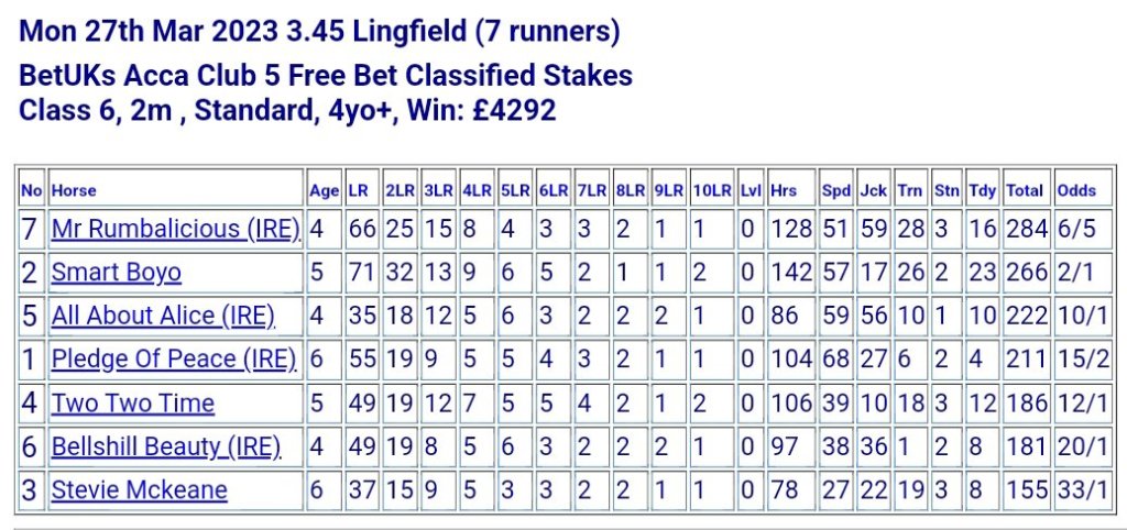 - Mr Rumbalicious (IRE) A maiden with respectable recent form, Mr Rumbalicious merits consideration despite the significant step up in trip. This horse’s claims are apparent in a weak race, but risks remain due to the first-time venture beyond 1m4f on the Flat. Estimated fair odds: 3/1
