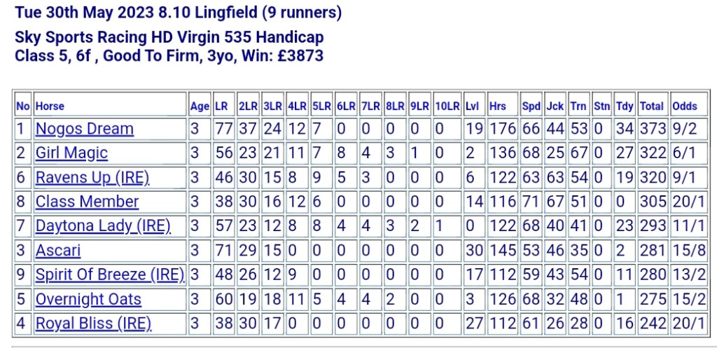 Each horse gets a total rating (Total) that reflects a combination or weighted sum of these factors. The odds could be compared to these ratings (67% of winners are in the top 4 ranked and around 25% Top ranked) to make value bets. Remember, while these ratings are a useful tool for making informed betting decisions, they are not guarantees of a horse’s performance.