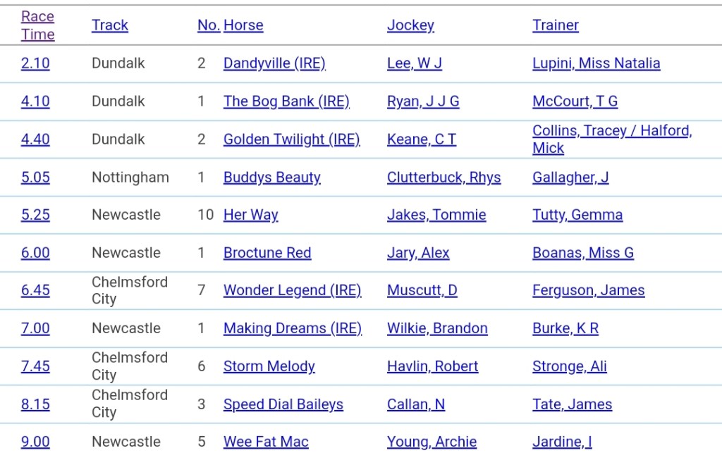 - Notes: A strong traveller who managed to win over 5f at Tipperary on reappearance. Her recent performance, finishing second when returned to 5f at Ayr last week, was noteworthy. There’s a concern about her potentially slow start, but if she replicates her recent form, especially on her first AW start since her debut, she remains a contender.