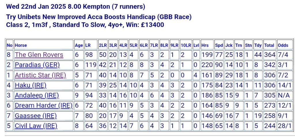 - The Glen Rovers (7/4 favourite): A consistent all-weather performer, boasting a 67% win rate on synthetic surfaces. Likely to be positioned just behind the pace, he has the stamina and class to assert himself in the final furlongs. His recent form at Kempton and ability to stay on strongly makes him the one to beat.