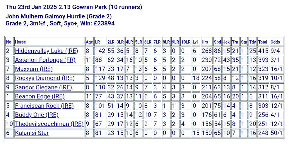 - Form: Grade 1 experience, including a strong 2nd at Punchestown (23.5f, Yielding).