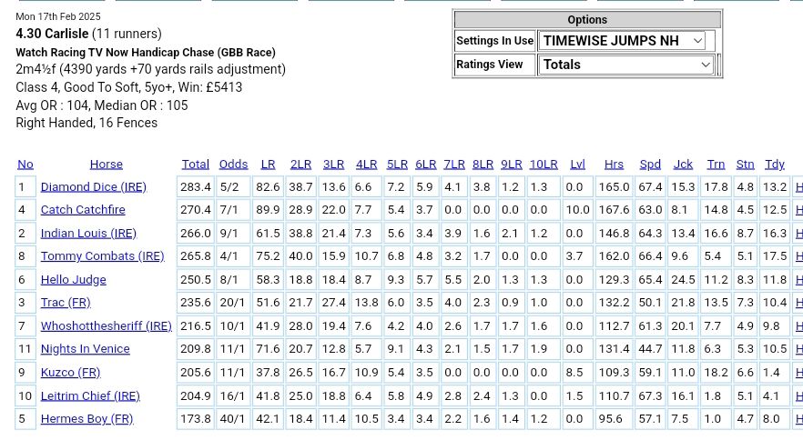 The market has taken a clear stance with Diamond Dice (IRE) priced at 5/2, and it’s easy to see why. The eight-year-old has been steadily improving, reflected in a standout last run rating of 82.6, comfortably the highest in this field. With a solid overall rating of 283.4, this runner brings the right blend of stamina and tactical speed for today’s conditions. Carlisle’s right-handed track and the good-to-soft going should pose no issues, particularly given its staying power over similar trips. The trainer’s solid form (17.8) and the jockey’s reliability (15.3) further enhance its profile. Diamond Dice looks the most dependable option, and while its price is relatively short, it appears justified.