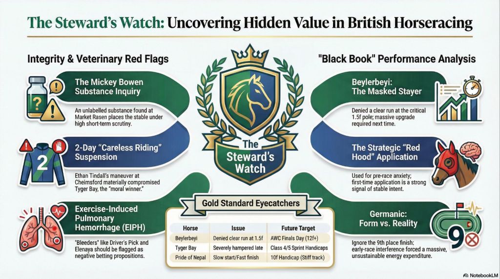 This was a week where the Stewards’ Reports mattered more than the results. Integrity scrutiny, tactical interference and veterinary disclosures combined to obscure genuine ability. Those prepared to look beyond the bare form now hold a significant edge as the winter season unfolds and the All-Weather Championships reach their peak.