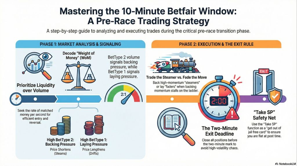 At ten minutes out, we are entering a critical transition phase. The money is beginning to arrive, but we are not yet in the high-volatility “scrum” that occurs two minutes before the off. My approach at this specific window relies on distinguishing liquidity from volume, interpreting Weight of Money (WoM) signals, and setting strict exit horizons.
